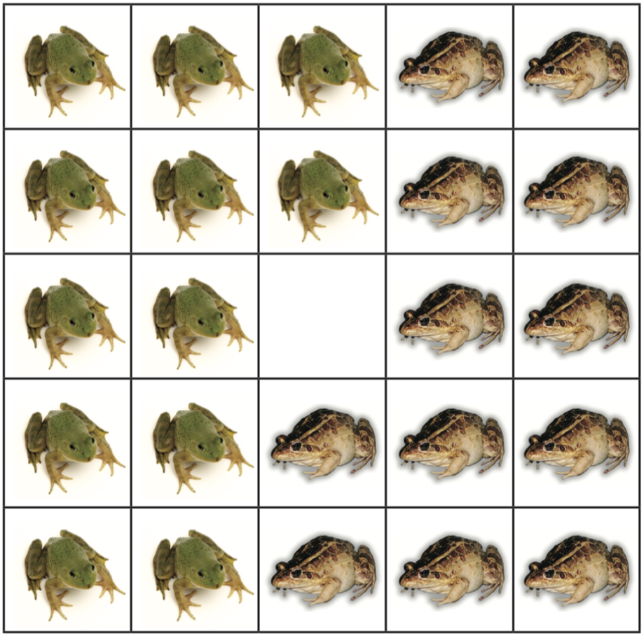 In this game, frogs can move right or down. Toads can move left or up. A frog or toad can slide into an adjacent empty space. They can also jump over exactly one of the other kind of animal to land in an empty space. They want to swap places, so that every place that now has a frog will have a toad, and vice versa. Can it be done? How?