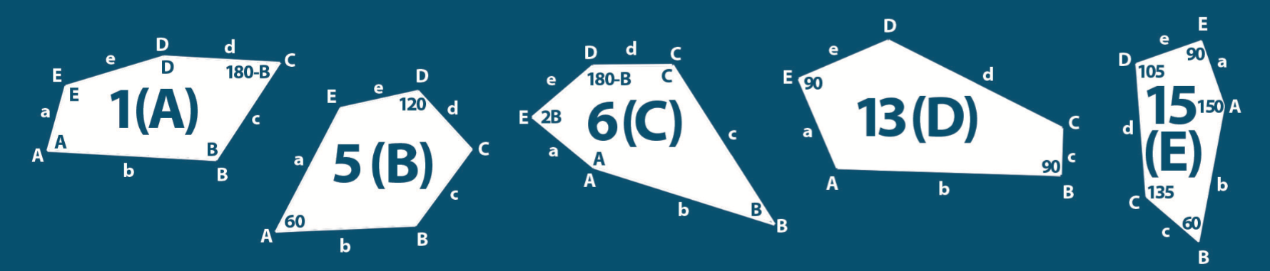 | Shape Fifteen (E) | a = c = e, b = 2a, A = 150°, B = 60°, C=135°, D = 105°, E = 90° |