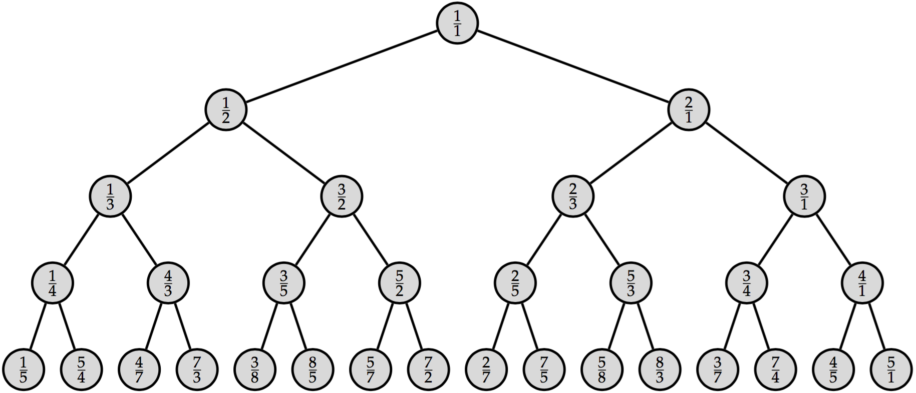 - Every node has a left and right “child” node below it. If the node is labeled i/j, then its left child is labeled i/(i+j) and its right child is labeled (i+j)/j.